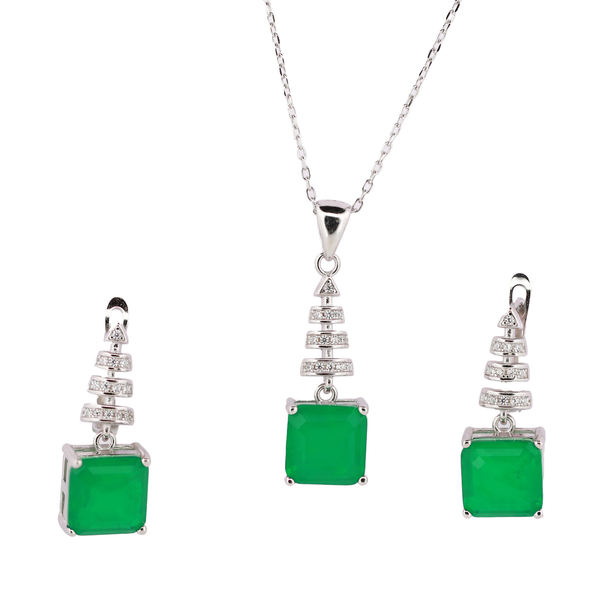92.5 Sterling Silver Tiered Geometric Chain Pendant Combo Set 15839 - Rhodium / Green / 11.65
